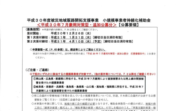 平成30年7月豪雨対策型 小規模事業者持続化補助金公募がはじまりました!